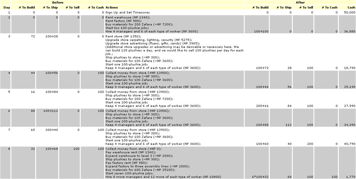 The above is probably inaccurate and does not use funds efficiently. Describing a strategy in further detail will require additional experience with multiple assembly lines, more experimentation with optimal hiring patterns, and more analysis of the trade offs of expanding the various buildings.