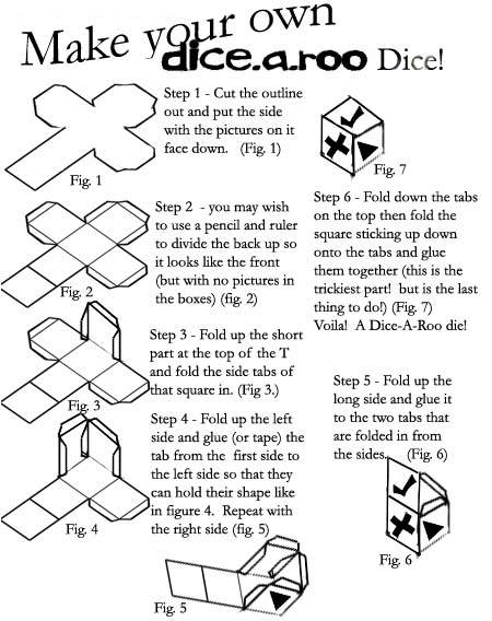 Note: another way to make the dice which is SLIGHTLY easier is to go to a department store (like Zellers or Wal-mart) and buy one of those packages of 5 or 6 dice and cover the dice with these paper cutouts. Then tape the covering closed so it doesn't slip off the die and voila! A Dice-A-Roo Die! Don't forget to color the dice first!